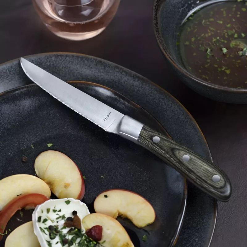Doté d’un manche en bois fumé orné de trois rivets en inox, chaque couteau allie robustesse, résistance à l’humidité et élégance naturelle.