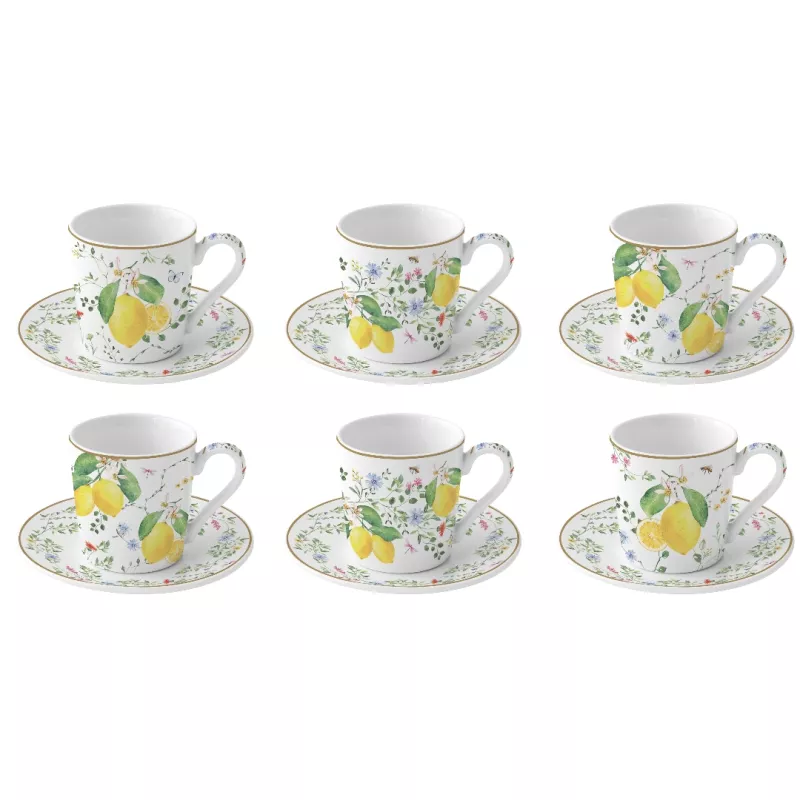 Découvrez notre ensemble de 6 tasses à café Nespresso et sous-tasses, issu de la collection Fleurs et Citrons.