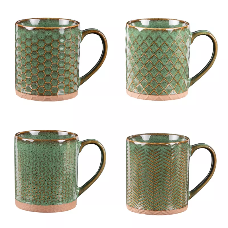 Chaque pièce se distingue par son motif moucheté vert, inspiré par la nature, et sublimé par des accents bronze subtils qui apportent une touche de sophistication. La finition brillante met en valeur leurs courbes élégantes et assure une prise en main confortable.