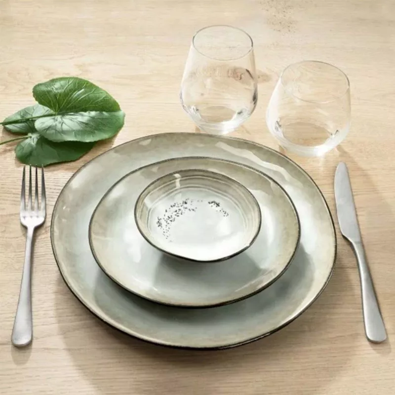 Une gamme d’articles de table de formes organiques en grès réactif émaillé et aux arrondis irréguliers.